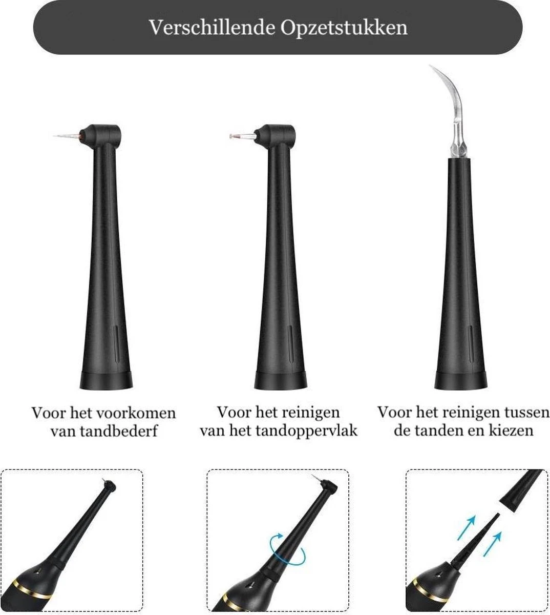 De Bluemay Tandsteen Verwijderaar komt inclusief drie verschillende opzetstukken. Deze opzetstukken zorgen ervoor dat u zo gericht en veilig mogelijk uw gebit gezond kunt houden.