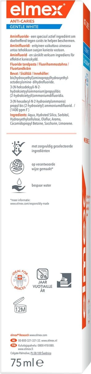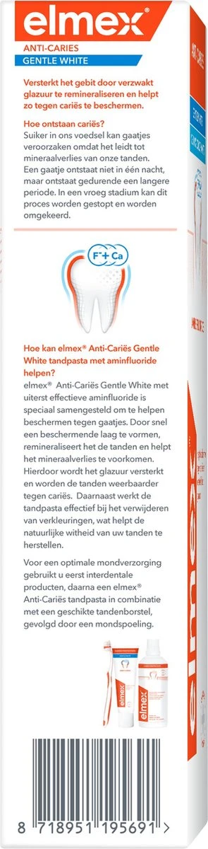 De elmex® Anti-Cariës Whitening Tandpasta vormt een tweevoudige actieve calcium-fluoride beschermlaag die remineraliseert en effectief beschermt tegen cariës. De tandpasta bereikt zelfs de oppervlaktes die met tandenpoetsen moeilijk te bereiken zijn en daarom extra kwetsbaar zijn voor cariës. De zachte whitening van de elmex Anti-Cariës Whitening tandpasta geeft natuurlijk witte tanden.