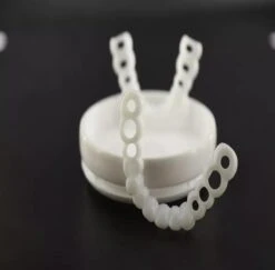 Gebruik, 1) Plaats de tanden in een kop heet water (bijna kokend) voor 1 minuut. Dit maakt de tanden flexibel en klaar om op maat gemaakt te worden. 2) Draai met een spiegel de tanden stevig over je bestaande tanden. Druk ze stevig tegen je tanden en klop voorzichtig op het afdrukmateriaal met je duimen achter je echte tanden. 3) Verwijder de tanden voorzichtig uit je mond na ongeveer 30 seconden en plaats ze in een glas koud water om af te koelen.