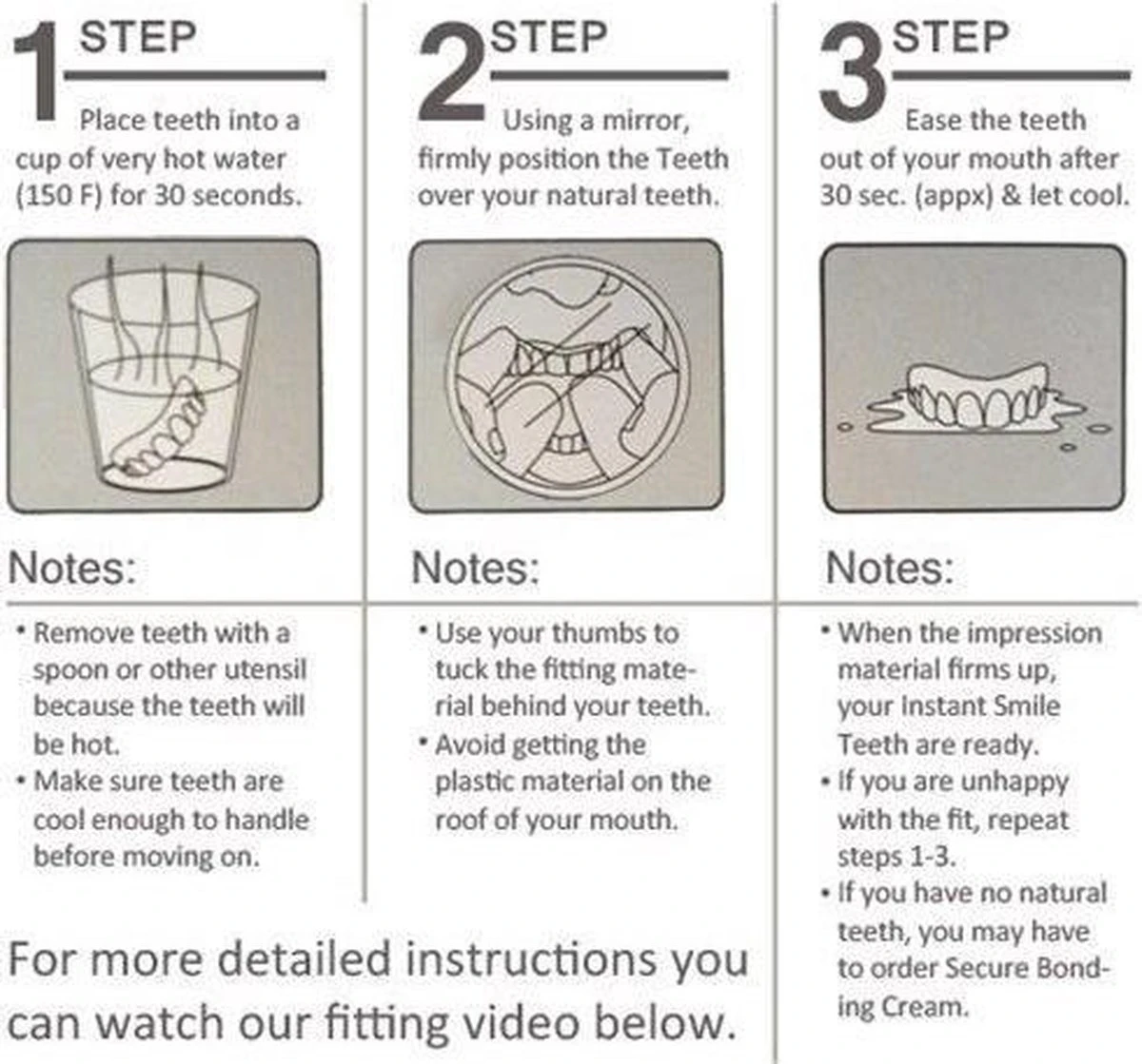 InstantSmile wordt geleverd met een bitje van siliconen: een beetje vergelijkbaar met de bitjes die boksers dragen. Deze zorgen ervoor dat jouw kunstgebit zich binnen vijf minuten naar je werkelijke gebit vormt. Dompel het bitje hiervoor in warm water. Lukt het niet? Geen zorgen. De handeling is eindeloos te herhalen – net zo lang tot jouw InstantSmile goed zit.