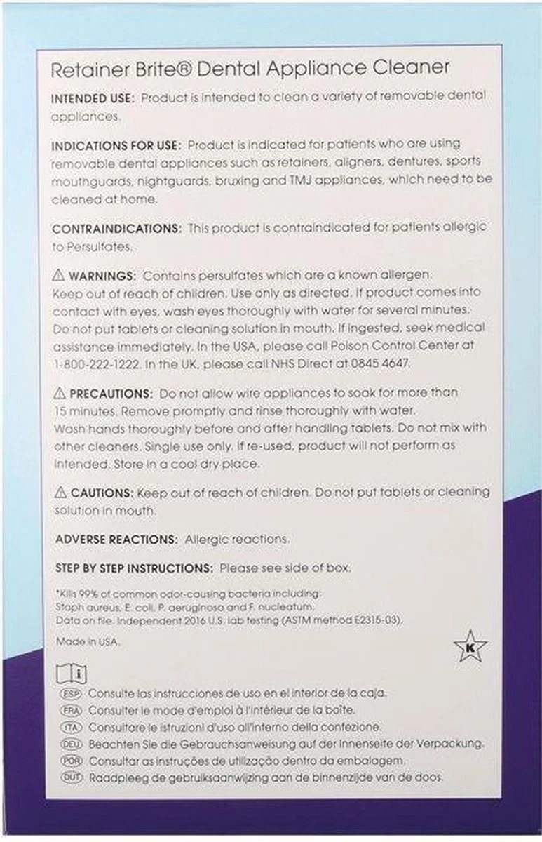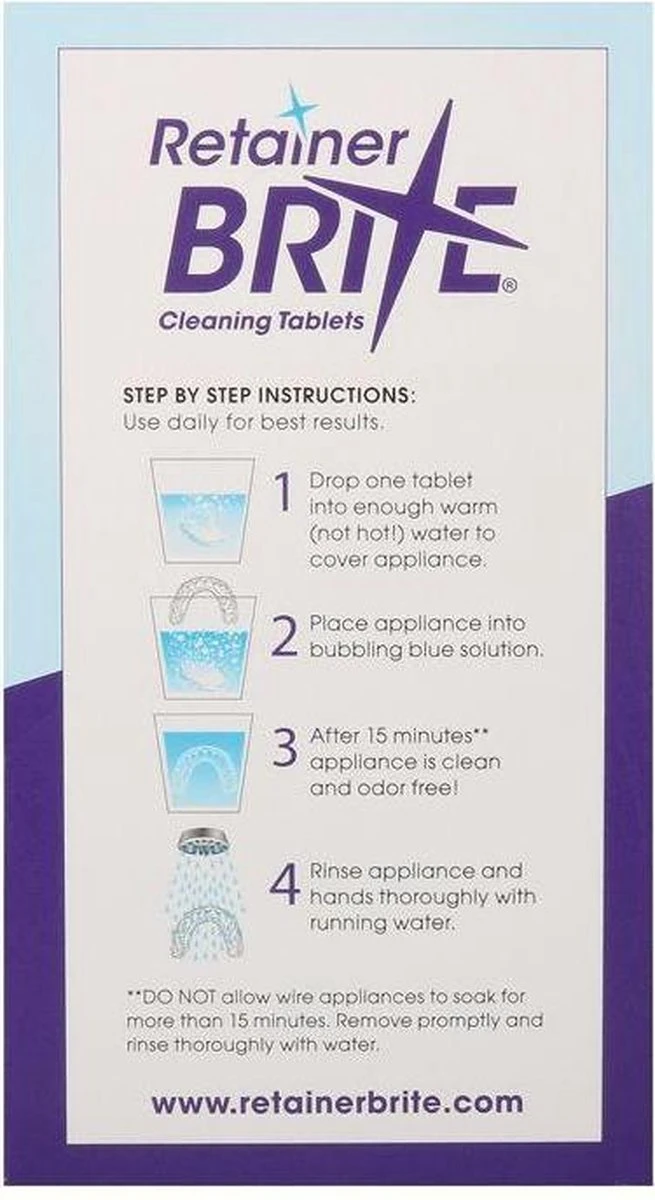 Retainer Brite reinigingstabletten helpen bij het dagelijks grondig schoonmaken van een beugel, sportbitje of kunstgebit. Het kan ook voor ieder ander uitneembare tandheelkundige voorzieningen zoals hockey bitjes, rugby bitjes, box bitjes, gebitsprothese, frameprothese, plaatje, snurkbeugel, spalk, splint of een ortho beugel.