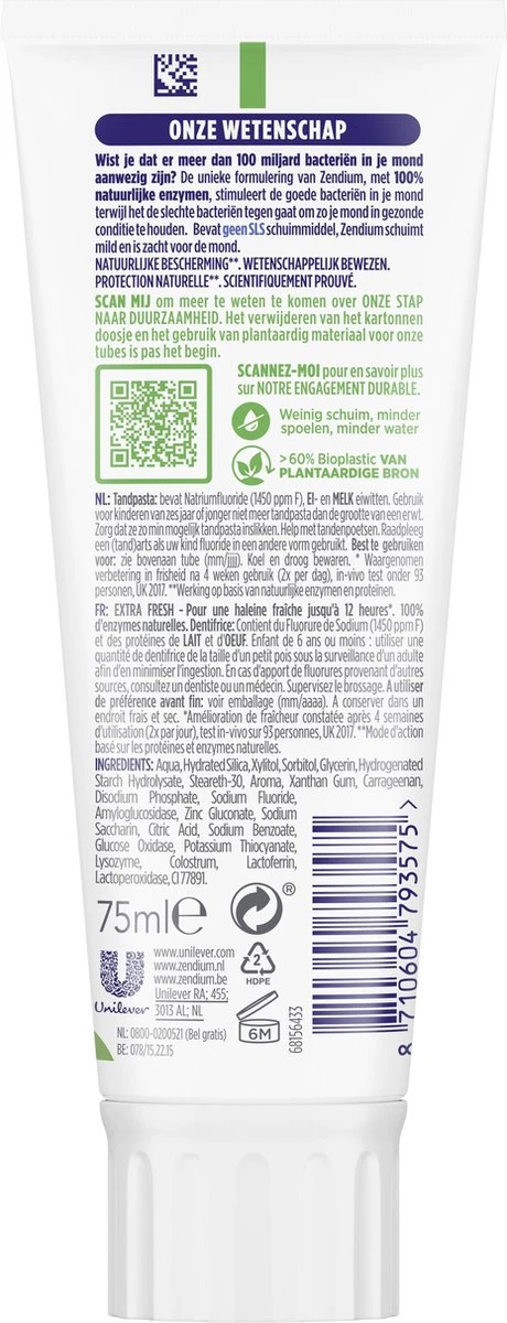 • Zendium Extra Fresh Tandpasta bevat 100% natuurlijke enzymen
